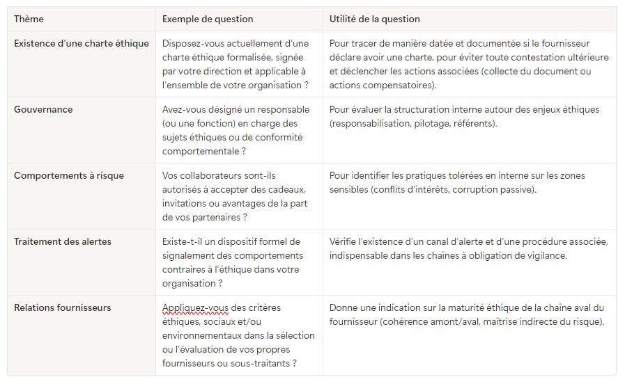 Si le tiers ne dispose pas d’une charte éthique, vous gagneriez à lui soumettre un questionnaire éthique, à remplir avant validation du contrat. Objectif : sensibiliser le tiers à vos attentes en la matière et détecter d’éventuels écarts ou zones de fragilité (absence de procédure d’alerte, d’engagements sociaux formalisés, de formation à l’éthique, etc.).