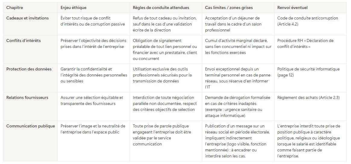 Nous recommandons de fixer une structure homogène aux différents chapitres, par exemple avec un titre explicite et factuel, un exposé de l'enjeu éthique, les règles de conduite attendues, les zones grises (avec la position officielle de l'entreprise) et un envoi éventuel.