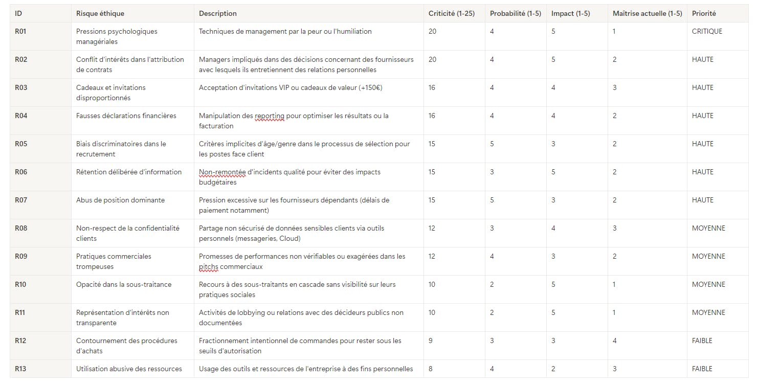 Selon les réponses, il peut être utile d’attribuer un score d’exposition éthique, ou de classer les tiers selon des niveaux de maturité (non documenté / engagements généraux / formalisé et suivi / certifié par un tiers).