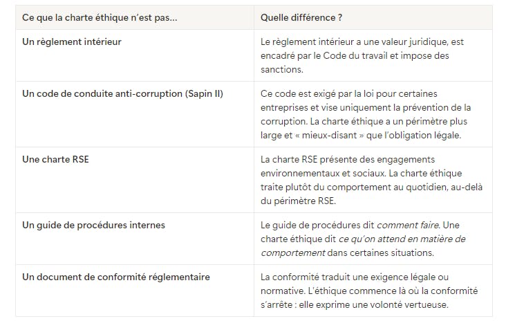 Cela ne signifie pas qu’une charte éthique ne peut pas rappeler les obligations légales et les interdits. Au contraire : nombre d’entreprises y reprennent des éléments déjà couverts par la loi, pour les rendre plus visibles ou les articuler à leur culture interne.