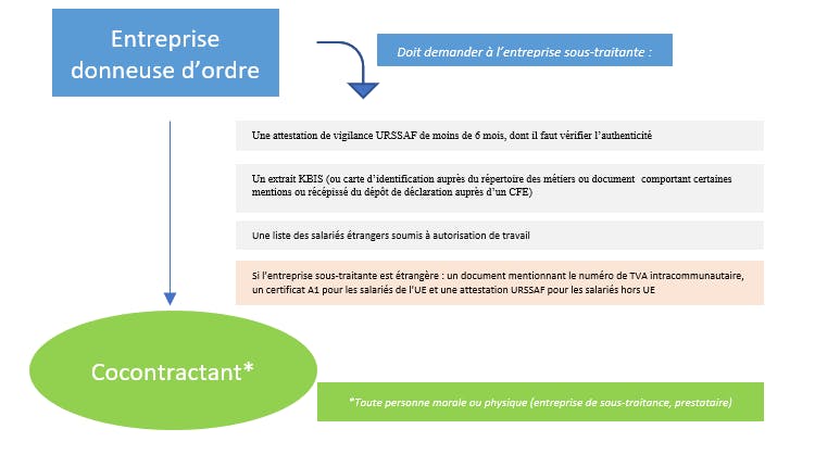 Pour rappel, lorsqu’un contrat de sous-traitance est conclu pour un montant au moins égal à 5.000€ hors taxe, l’obligation de vigilance impose à l’entreprise donneuse d’ordre de vérifier que son cocontractant s’acquitte des formalités légales obligatoires (déclarations sociales et fiscales, déclarations d’activités, déclarations des salariés travaillant pour lui ainsi que toutes les obligations légales afférentes à son activité telles que la délivrance d’un bulletin de paie, les déclarations de salaire et cotisations sociales etc.).