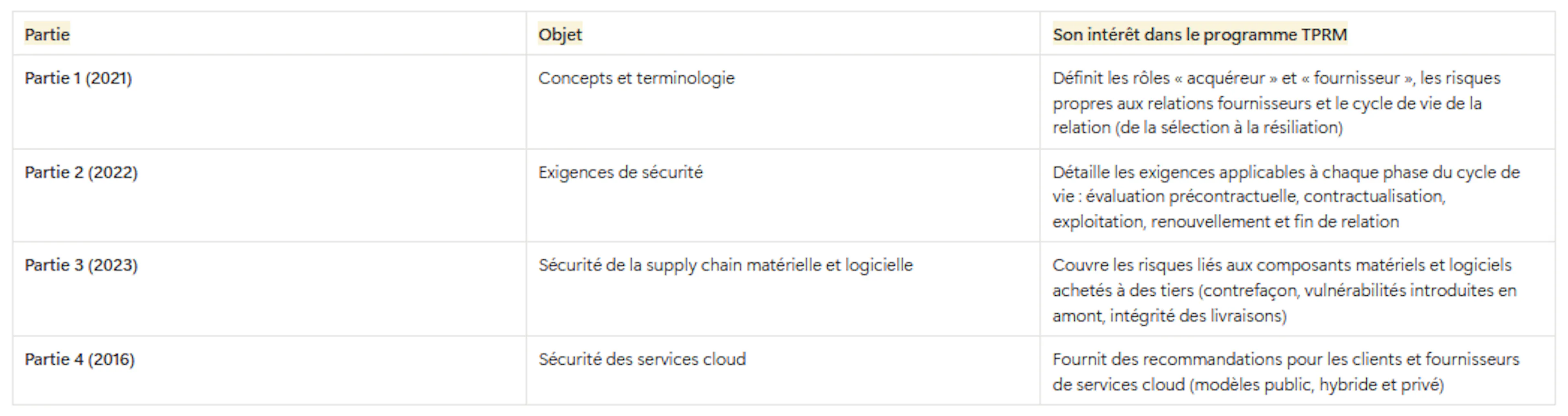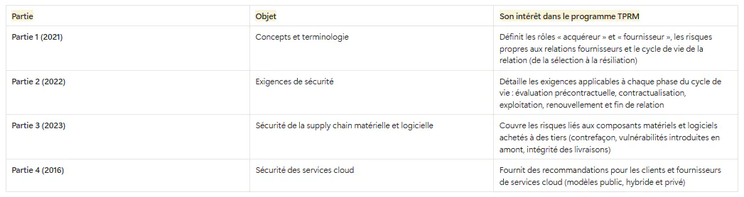 Partie Objet Son intérêt dans le programme TPRM Partie 1 (2021) Concepts et terminologie Définit les rôles « acquéreur » et « fournisseur », les risques propres aux relations fournisseurs et le cycle de vie de la relation (de la sélection à la résiliation) Partie 2 (2022) Exigences de sécurité Détaille les exigences applicables à chaque phase du cycle de vie : évaluation précontractuelle, contractualisation, exploitation, renouvellement et fin de relation Partie 3 (2023) Sécurité de la supply chain matérielle et logicielle Couvre les risques liés aux composants matériels et logiciels achetés à des tiers (contrefaçon, vulnérabilités introduites en amont, intégrité des livraisons) Partie 4 (2016) Sécurité des services cloud Fournit des recommandations pour les clients et fournisseurs de services cloud (modèles public, hybride et privé)