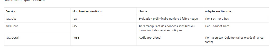 Version Nombre de questions Usage Adapté aux tiers de... SIG Lite 128 Évaluation préliminaire ou tiers à faible risque Tier 3 et Tier 2 bas SIG Core 627 Tiers manipulant des données sensibles ou fournissant des services critiques Tier 2 haut et Tier 1 SIG Detail 1 936 Audit approfondi Tier 1 à enjeux réglementaires élevés (finance, santé)