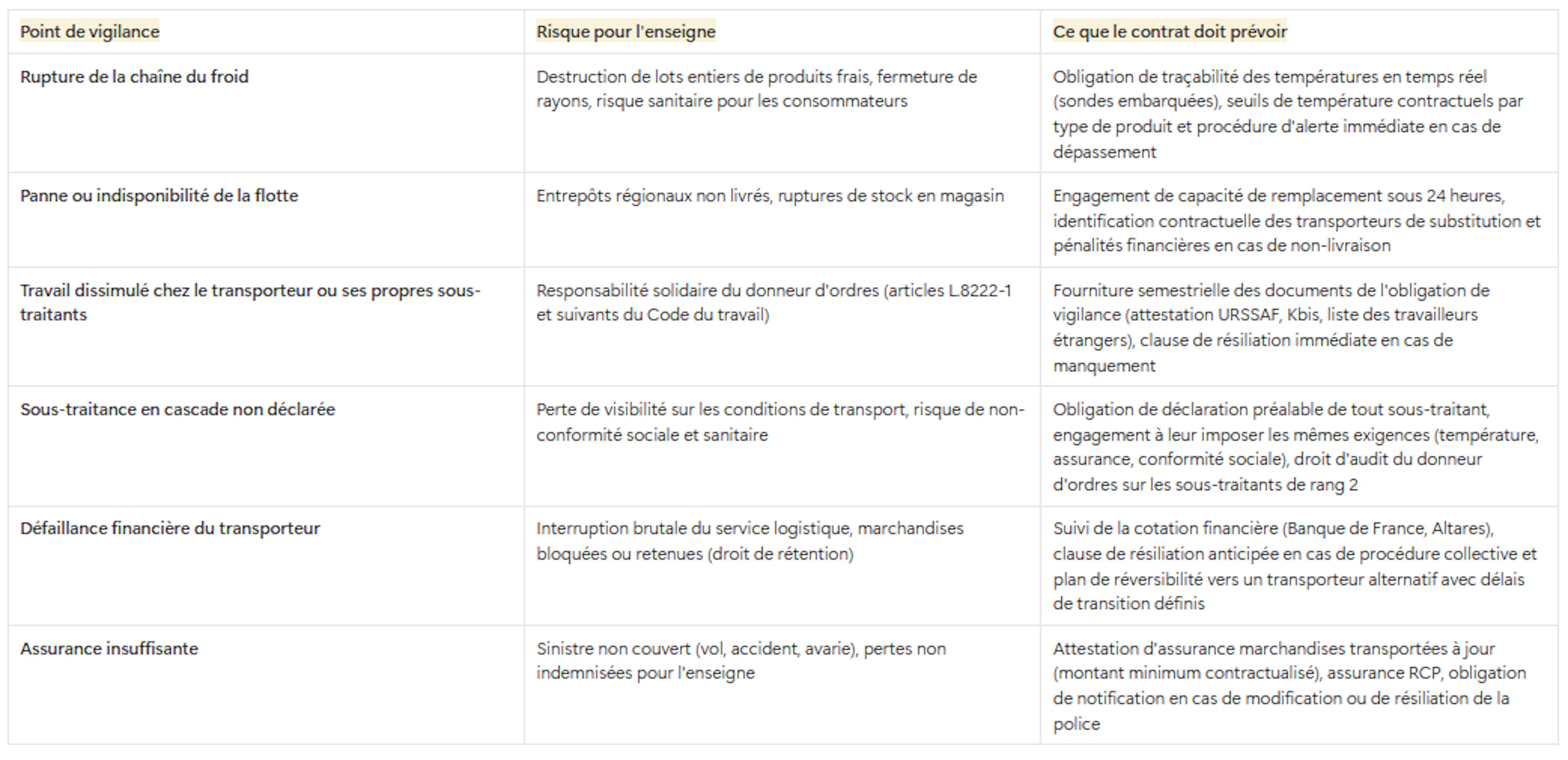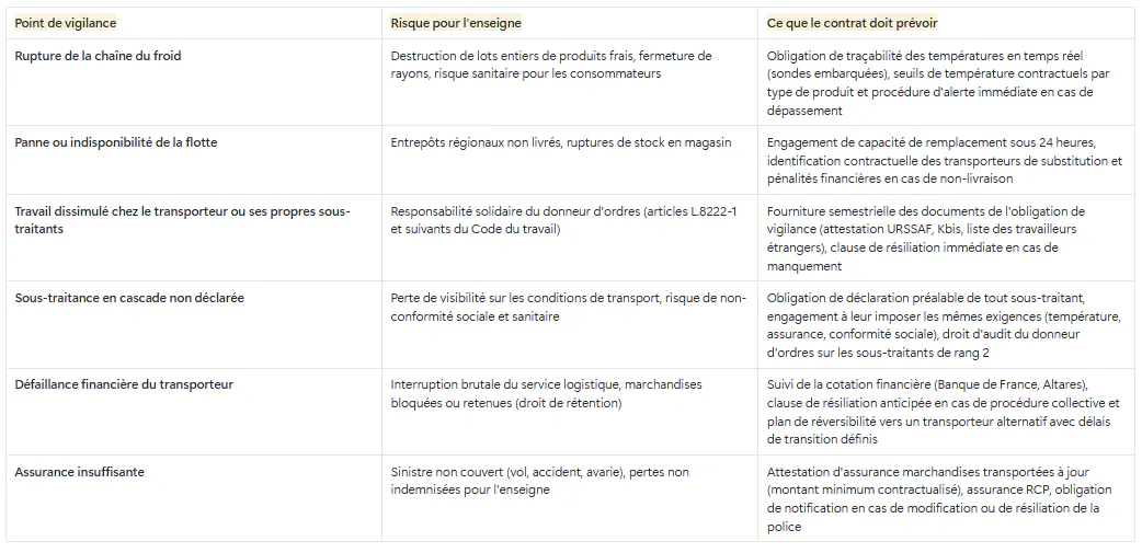 Point de vigilance Risque pour l'enseigne Ce que le contrat doit prévoir Rupture de la chaîne du froid Destruction de lots entiers de produits frais, fermeture de rayons, risque sanitaire pour les consommateurs Obligation de traçabilité des températures en temps réel (sondes embarquées), seuils de température contractuels par type de produit et procédure d'alerte immédiate en cas de dépassement Panne ou indisponibilité de la flotte Entrepôts régionaux non livrés, ruptures de stock en magasin Engagement de capacité de remplacement sous 24 heures, identification contractuelle des transporteurs de substitution et pénalités financières en cas de non-livraison Travail dissimulé chez le transporteur ou ses propres sous-traitants Responsabilité solidaire du donneur d'ordres (articles L.8222-1 et suivants du Code du travail) Fourniture semestrielle des documents de l'obligation de vigilance (attestation URSSAF, Kbis, liste des travailleurs étrangers), clause de résiliation immédiate en cas de manquement Sous-traitance en cascade non déclarée Perte de visibilité sur les conditions de transport, risque de non-conformité sociale et sanitaire Obligation de déclaration préalable de tout sous-traitant, engagement à leur imposer les mêmes exigences (température, assurance, conformité sociale), droit d'audit du donneur d'ordres sur les sous-traitants de rang 2 Défaillance financière du transporteur Interruption brutale du service logistique, marchandises bloquées ou retenues (droit de rétention) Suivi de la cotation financière (Banque de France, Altares), clause de résiliation anticipée en cas de procédure collective et plan de réversibilité vers un transporteur alternatif avec délais de transition définis Assurance insuffisante Sinistre non couvert (vol, accident, avarie), pertes non indemnisées pour l'enseigne Attestation d'assurance marchandises transportées à jour (montant minimum contractualisé), assurance RCP, obligation de notification en cas de modification ou de résiliation de la police