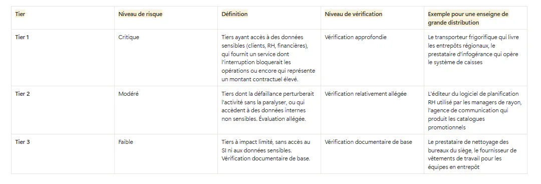 Tier Niveau de risque Définition Niveau de vérification Exemple pour une enseigne de grande distribution Tier 1 Critique Tiers ayant accès à des données sensibles (clients, RH, financières), qui fournit un service dont l'interruption bloquerait les opérations ou encore qui représente un montant contractuel élevé. Vérification approfondie Le transporteur frigorifique qui livre les entrepôts régionaux, le prestataire d'infogérance qui opère le système de caisses Tier 2 Modéré Tiers dont la défaillance perturberait l'activité sans la paralyser, ou qui accèdent à des données internes non sensibles. Évaluation allégée. Vérification relativement allégée L'éditeur du logiciel de planification RH utilisé par les managers de rayon, l'agence de communication qui produit les catalogues promotionnels Tier 3 Faible Tiers à impact limité, sans accès au SI ni aux données sensibles. Vérification documentaire de base. Vérification documentaire de base Le prestataire de nettoyage des bureaux du siège, le fournisseur de vêtements de travail pour les équipes en entrepôt