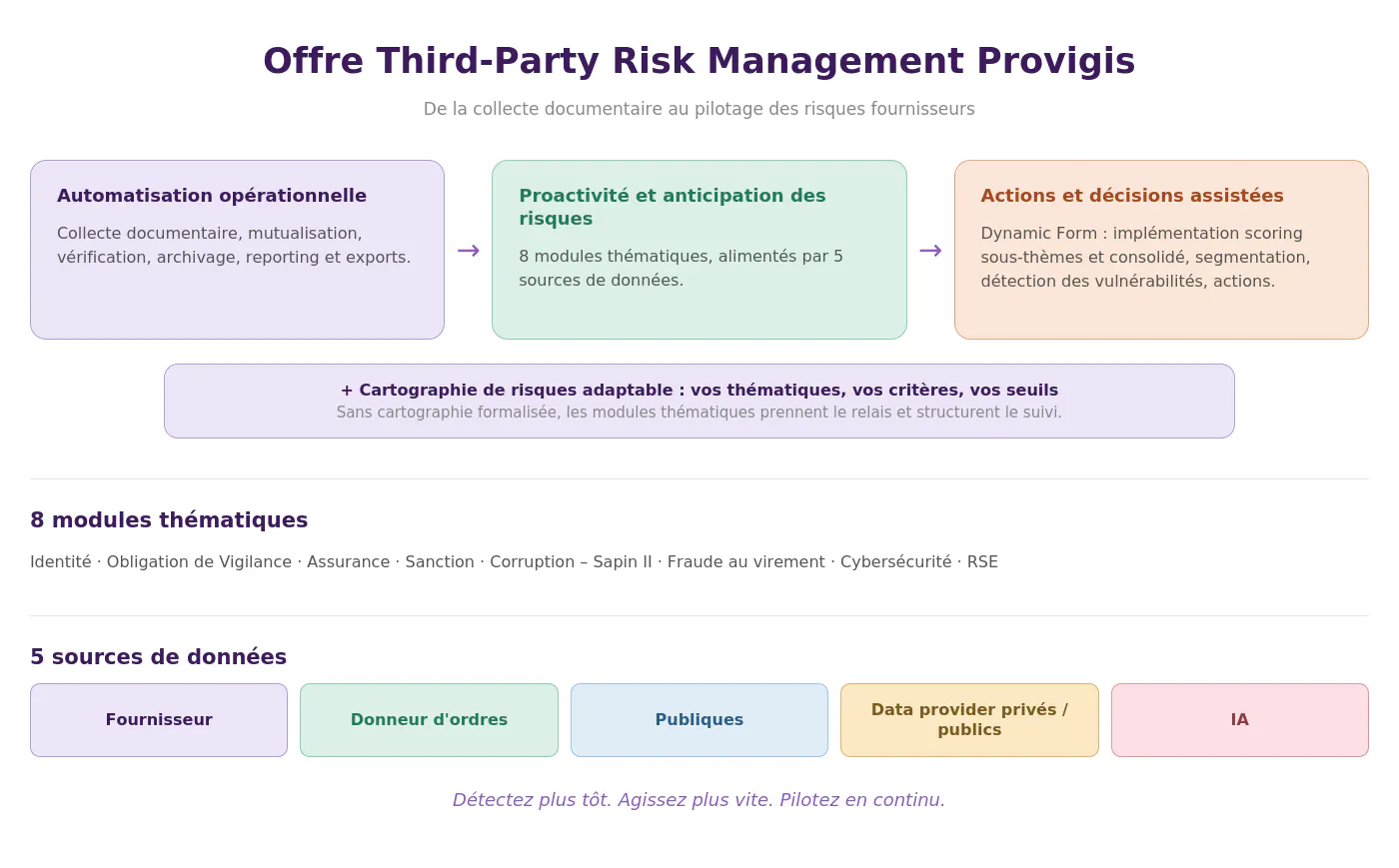 C'est précisément la logique qui sous-tend la nouvelle offre TPRM Provigis : Provigis Risk Pilot agrège les cinq sources de données (fournisseur, donneur d'ordres, bases publiques, data providers privés/publics et IA ) qui alimentent les huit modules thématiques (Identité, Obligation de Vigilance, Assurance, Sanction, Corruption , Sapin II, Fraude au virement, Cybersécurité, RSE). Les équipes achats, conformité et RSSI disposent ainsi d'une vision consolidée et actualisée en continu du profil de risque de chaque tiers, plutôt que d'une juxtaposition de contrôles ponctuels.